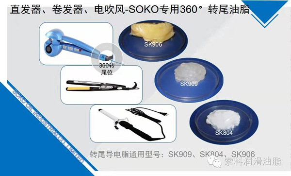 索科SOKO轉(zhuǎn)尾油脂專為直發(fā)器/卷發(fā)器360度無死角長效應(yīng)用,有效減少磨損,對塑膠及貴金屬無化學(xué)反應(yīng),索科SOKO專用轉(zhuǎn)尾油脂SK909 和SK908系列/電源線轉(zhuǎn)動部位接點潤滑油廣泛應(yīng)用于各大國際知名品牌廠的直發(fā)器、自動卷發(fā)神器中。