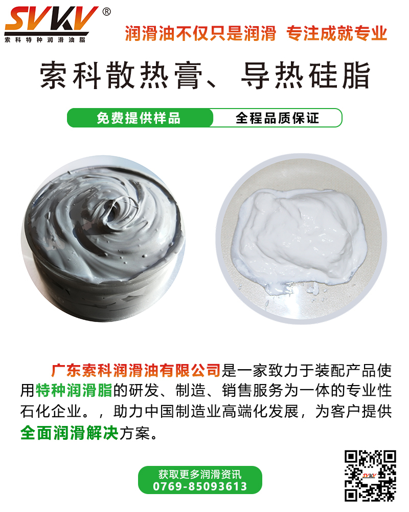 SVKV索科系列導(dǎo)熱硅脂適用溫度廣泛,不易出現(xiàn)風(fēng)干硬化或熔化現(xiàn)象,同時(shí)具有耐高低溫能力。主要用于填充發(fā)熱體與散熱片之間的空隙,提高散熱效果,改善電子/電氣器件向散熱器或底盤的熱轉(zhuǎn)移,增加器件的總體效能。