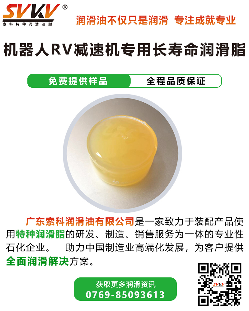 索科SVKV機(jī)器人RV減速機(jī)專用長壽命潤滑脂選用高性能基礎(chǔ)油,并添加多種高效抗氧化、抗腐蝕添加劑精制而成,是專為各種機(jī)器人減速電機(jī)齒輪和傳動部位而研制的齒輪潤滑油脂。索科SVKV機(jī)器人RV減速機(jī)專用長壽命潤滑脂能有效減少RV減速機(jī)磨損,降低噪音,達(dá)到延長使用壽命的效果。