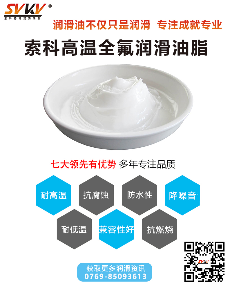 索科SVKV高溫全氟潤滑油脂是由聚四氟乙烯(PTFE)并添加特種抗腐蝕添加劑精制而成的白色全氟聚醚潤滑脂,專用于高溫、高負載、化學腐蝕環(huán)境中的軸承、齒輪、頂針以及要求終生潤滑的部件,抗氧化、低揮發(fā)、不結(jié)焦、不積碳、抗腐蝕耐磨損、抗擠壓性好,特別是在極度高溫和惡劣環(huán)境下的使用。一般可使產(chǎn)品壽命延長10—60倍。