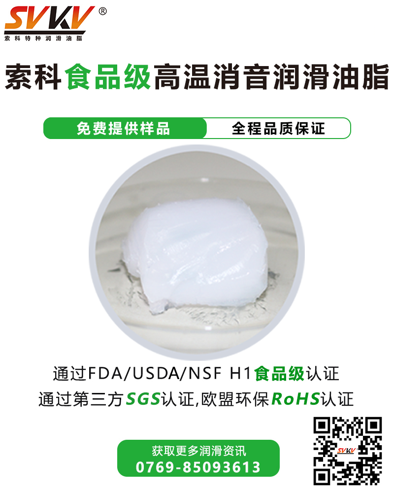索科SVKV食品級(jí)高溫消音潤(rùn)滑油脂選用食品級(jí)的基礎(chǔ)油和無(wú)毒無(wú)害的添加劑精制而成,專(zhuān)為食品加工和醫(yī)療設(shè)備而研制。索科SVKV食品級(jí)高溫消音潤(rùn)滑油脂符合美國(guó)FDA和USDA法規(guī)和標(biāo)準(zhǔn),并通過(guò)美國(guó)NSF H-1食品級(jí)認(rèn)證,保障烤箱食品安全健康。