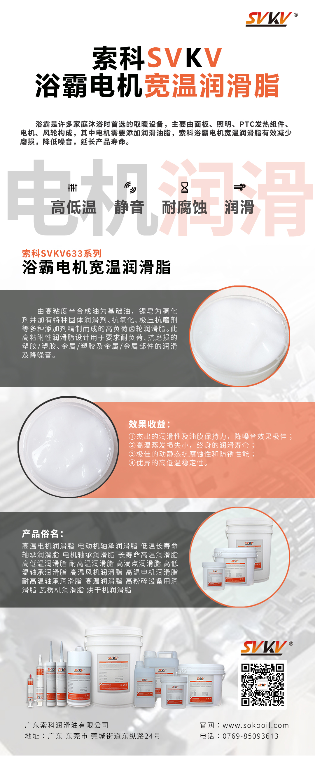 索科為企業(yè)提供潤滑方案,降本增效,適合的潤滑脂能有效減少磨損,降低噪音,延長產(chǎn)品壽命。索科提供浴霸電機寬溫潤滑脂0769-85093613免費樣品,全程品質(zhì)保證!