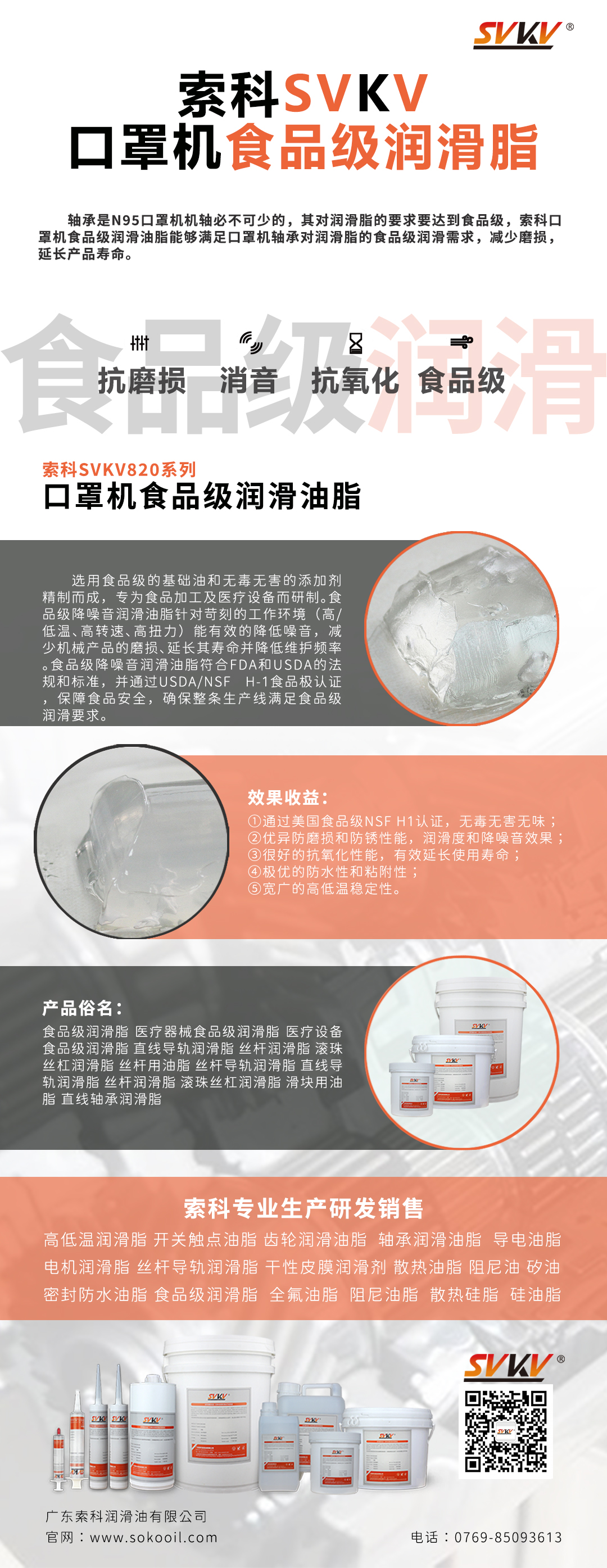 索科為企業(yè)提供潤滑方案,降本增效,適合的潤滑油脂能有效減少磨損,延長產(chǎn)品壽命。索科提供口罩機食品級潤滑油脂0769-85093613免費樣品,全程品質(zhì)保證!